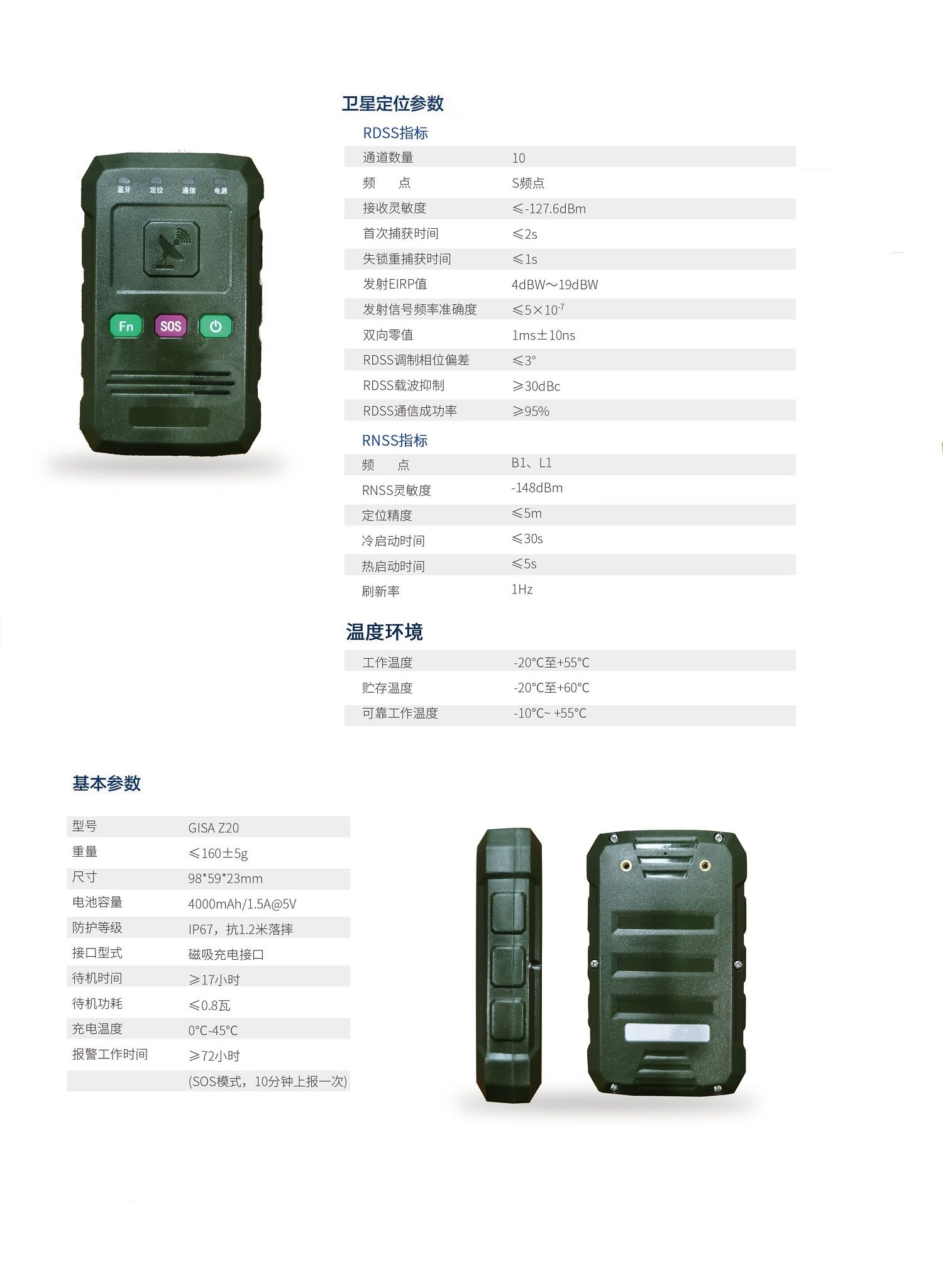 品牌:华辰北斗 型号:智图Z20 产地:中国 外形方式:98*59*23 mm 防水功能:IP68 南京君灿仪器现货销售应急指挥能力提升产品:北斗有源终端(主要用于应急通信,实现断网情况应急通讯。具备北斗短报文通信、位置上报等功能,配备北斗短报文通信软件,任意北斗终端与手机、北斗终端短信互通),北斗单兵终端(支持北斗三代,短报文通信,支持通信频次1秒/每次,携带方便),北斗数据终端、北斗手持终端、卫星定位仪(定位类型:支持BDS、SBAS卫星星座,支持使用单BDS定位),卫星电话、地图指挥仪(尺寸≥10英寸;CPU≥8核2.0GHz;RAM≥4GB;存储≥64GB),测距仪(具备测距、测高、测角、测速等功能,测距范围:3~1500m;测距精度:(300m以内)≤±0.2、(300m以上)≤±1m;测角范围:-90°~+90°,倾角精度:≤±1°;视野范围:7°,放大倍数≥7倍;有自动关机功能;)便携式流速仪/转子式流速仪(测速范围:0.01-8 m/s;测流误差:≤1.5%或优于;采样时间 1~999s 任意设定;测量方式:测杆定位测量或优于;温度范围:-20℃-50℃)。等产品,支持单北斗定位,欢迎来电咨询: 。 -