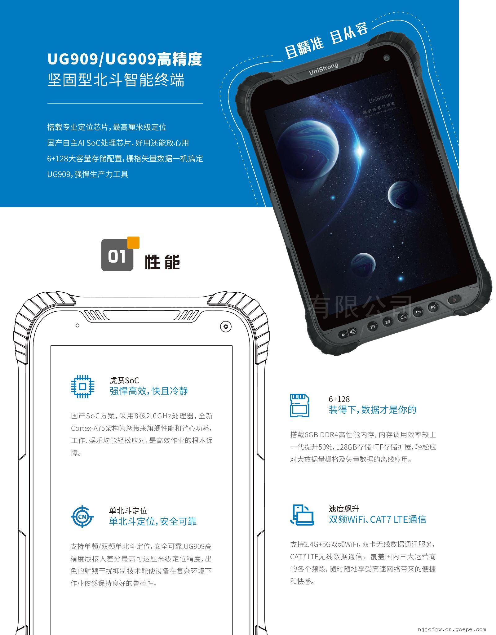 品牌:集思宝 型号:UG909 材质:工业三防 产地:中国 内存:6+128 GPS定位精度:单点定位:2-5m SBAS:1-3m 外形方式:235×146×14.5 mm 防水功能:IP68 无线类型:内置北斗定位仪芯片 外接电源形式:USB-TypeC,支持OTG 坚固型北斗智能终端-UG909