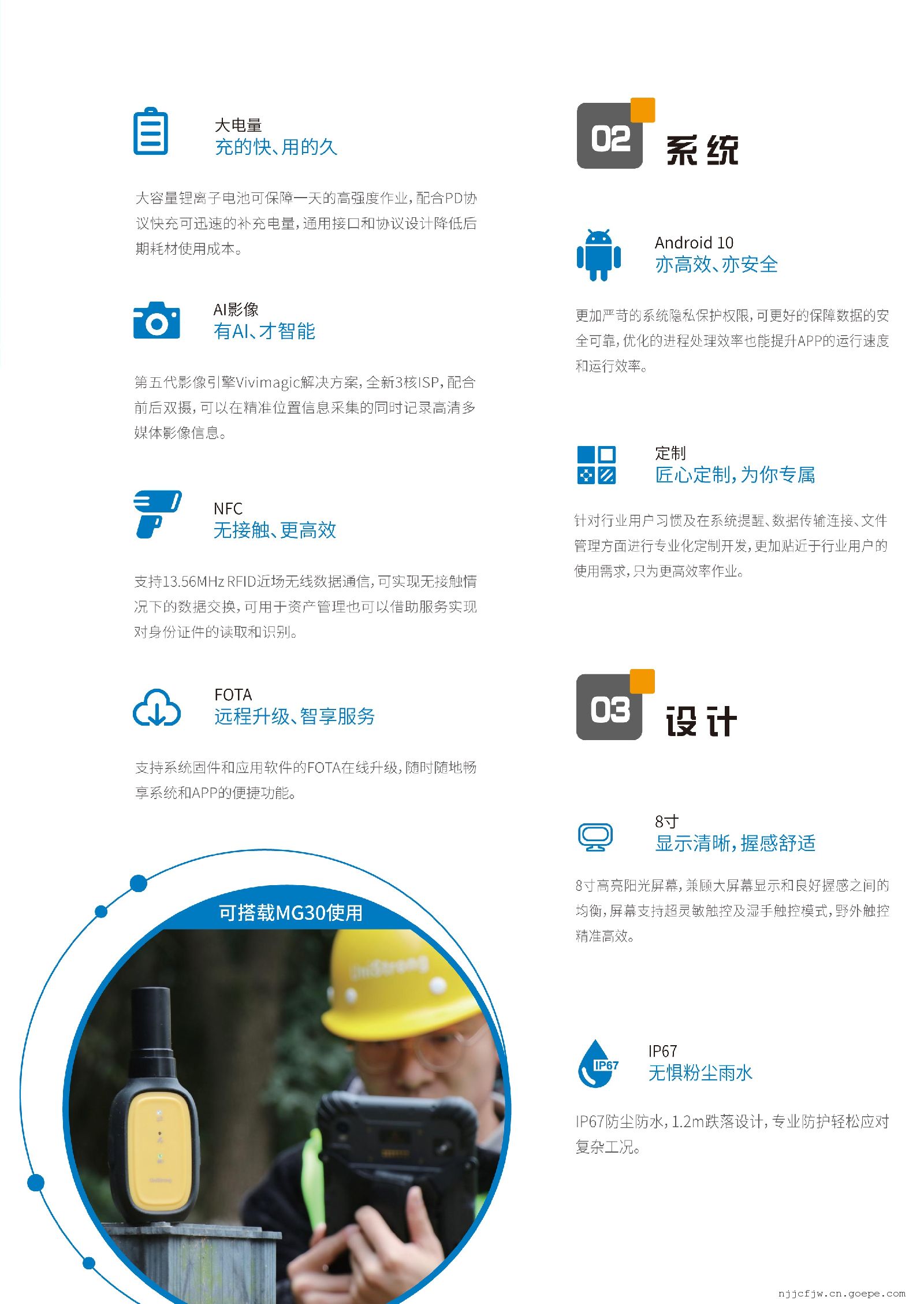 集思宝UG909,搭载国产自主AI SoC处理芯片,使用基于Android10.0的操作系统,处理更高效,数据更安全。搭载定位芯片,收星快精度高; 6+128GB存储配置,运行流畅,储存无忧。UG909,户外作业好帮手!